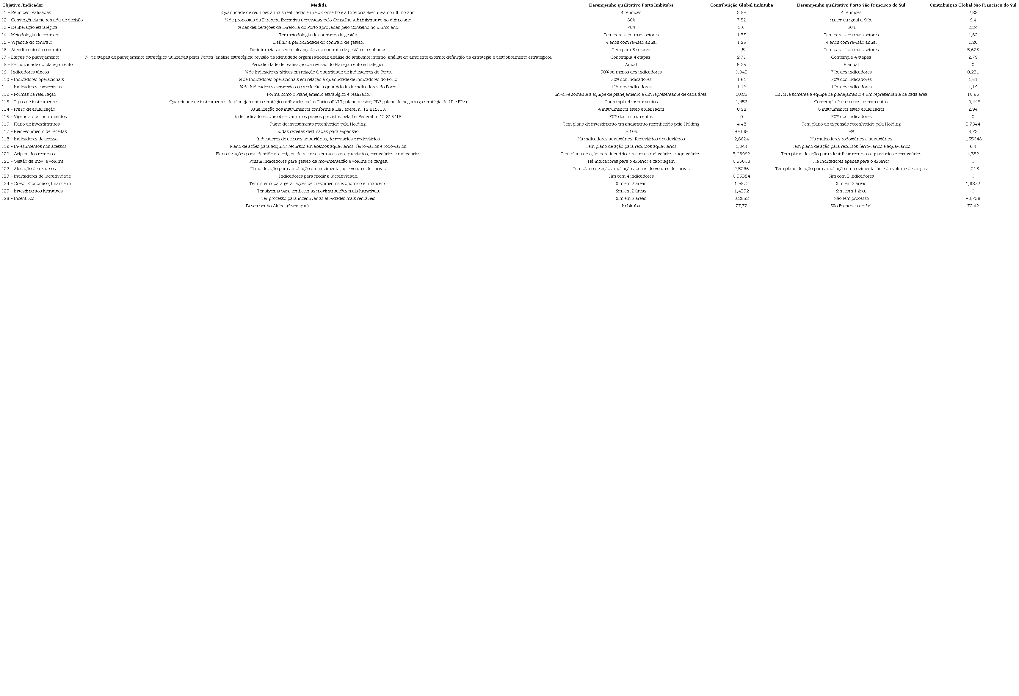Embora as ações tenham sido propostas levando em consideração o desempenho dos Portos individualmente, por se tratar de um modelo construído para a Holding avaliar o desempenho dos Portos, qualquer ação irá impactar o aprimoramento do desempenho de todos os membros do grupo. Assim, caso o plano de ação proposto para o critério ‘Incentivos (I26)’ seja implementado, os Portos passarão a ter um processo para identificar as atividades mais rentáveis, possibilitando aumentar sua lucratividade. Desse modo, com a implementação das ações propostas, o desempenho do Porto de São Francisco do Sul pode passar de 72,42 para o statu quo de 90,03. Do mesmo modo, o desempenho do Porto de Imbituba passará de 77,72 para 85,27, evidenciando a utilidade do modelo proposto como instrumento de apoio à gestão.