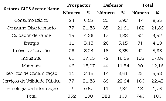 A Tabela 1 apresenta a distribuição da amostra por setor e estratégia mantida pela organização. As 740 observações consistem em 352 empresas do tipo prospector (Score > 18) e 388 empresas do tipo defensor (Score < 18). Consistente com Bentley et al. (2013) e Hsieh et al. (2019), o percentual de empresas que adotam as duas estratégias é semelhante em cada um dos setores.