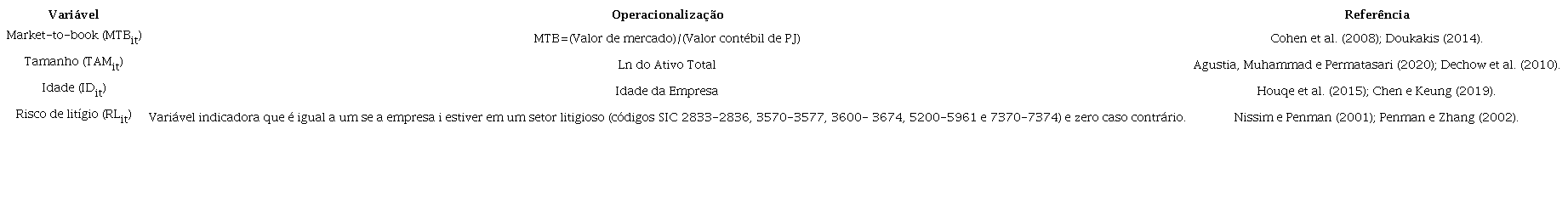 Utilizou-se ainda um conjunto de variáveis de controle que podem influenciar o gerenciamento de resultados. A Tabela 2 sintetiza a operacionalização dessas variáveis.