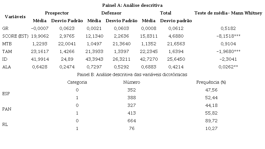 Em relação às variáveis de controle, o MTB apresenta média menor para as empresas defensoras em relação às prospectoras. Em média, as empresas prospectoras são maiores (TAM) e mais jovens. Cerca de 10% das empresas da amostra são classificadas como voltadas para um ambiente litigioso, 47,56% apresentam estratégia prospectora e 55,82% demonstraram erros menores na previsão dos analistas.