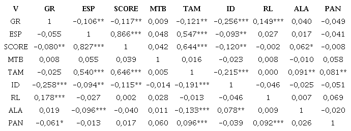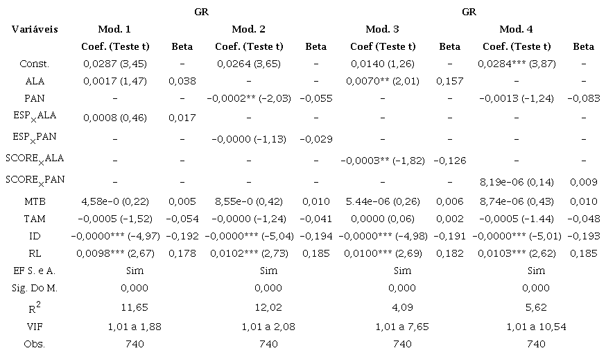 A Tabela 4 demonstra as correlações de Spearman e Pearson entre as variáveis analisadas na regressão. Percebe-se que o GR possui correlação negativa com a estratégia prospectora (medida pelo SCORE) e com a idade (ID), o que indica que empresas com estratégia prospectora e mais velhas tendem a estar associadas a menores práticas de gerenciamento de resultados. Por outro lado, empresas de setores com maior risco de litígio (RL) apresentam-se associadas positivamente ao GR.