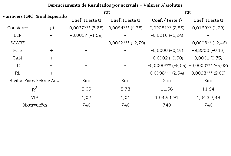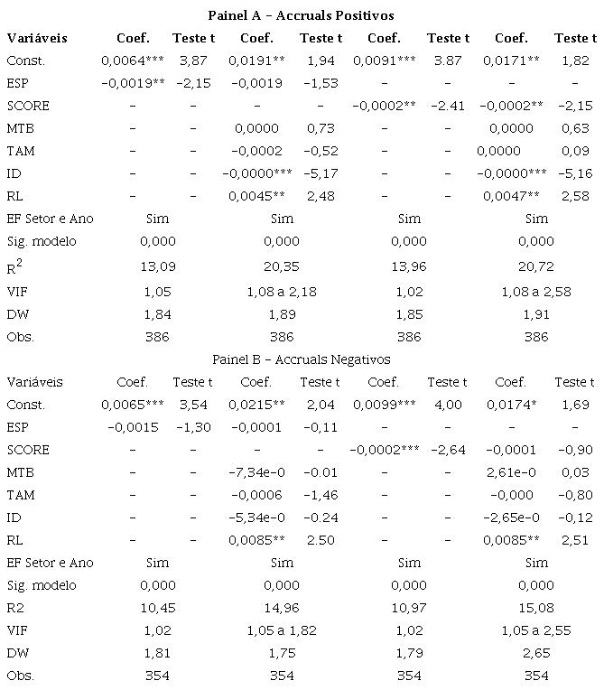 Para testar a hipótese, realizou-se regressões lineares múltiplas (OLS), com erros padrão robustos para controlar problemas de heterocedasticidade, e com controle de efeitos fixos de setor e ano. Os accruals foram analisados em valores absolutos. Os resultados desses testes estão resumidos na Tabela 5, na linha (1) a variável independente ESP é a variável dummy (empresa prospectora), enquanto na linha (2) a variável independente SCORE é a pontuação da estratégia do negócio.
