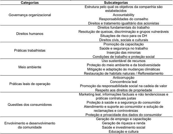 Para realização da análise de conteúdo foi elaborado um constructo de Responsabilidade Social Corporativa (Quadro 1) a partir da ABNT NBR ISO 26000 - Diretrizes sobre Responsabilidade Social, Norma Técnica Brasileira (NBR) elaborada pela Associação Brasileira de Normas Técnicas (ABNT), representante brasileira oficial da International Organization for Standardization (ISO). Dessa forma, foram elaboradas 7 categorias e 28 subcategorias utilizadas para conduzir a análise de conteúdo.