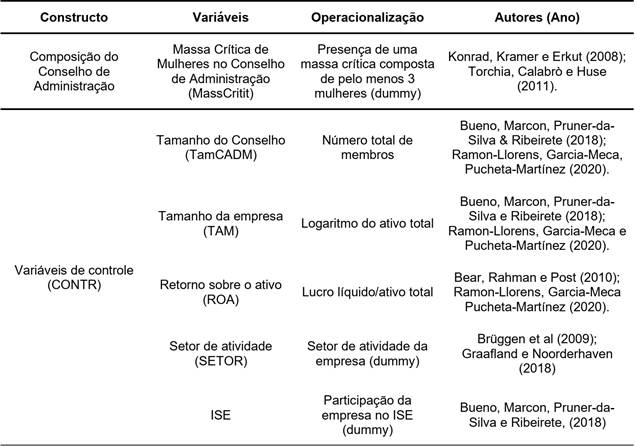 As variáveis independentes foram selecionadas a partir de estudos anteriores e os dados foram obtidos a partir do Formulário de Referência das empresas que compõem a amostra do estudo, nos respectivos anos delimitados. As variáveis independentes e de controle são evidenciadas na Quadro 2.