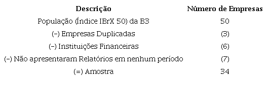 Inicialmente, foram identificadas 3 empresas duplicadas na população do estudo, as quais foram excluídas da composição da amostra. A duplicação ocorreu quando mais de uma empresa do mesmo grupo ou conglomerado participaram simultaneamente da composição do IBrX50. Além disso, optamos por remover 6 empresas caracterizadas como Instituições Financeiras, por suas especificidades (Khan, 2010), pois o setor financeiro apresenta estrutura específica em seu plano de contas, na qual a alavancagem diferenciada faz parte de uma característica destas empresas (Silva Júnior, Gomes, Camara & Leite Filho, 2022), que em comparação as demais, poderia enviesar os resultados da amostra.