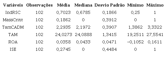 Destaca-se ainda que o nível mínimo de divulgação de informações de RSC foi de 25%; já o máximo foi 100%. Percebe-se que as variáveis não apresentaram grande dispersão dos dados em torno da média, em que a que apresentou maior dispersão foi a variável TAM (1,3415). As variáveis TAM e TamCADM apresentaram as maiores médias, 24,0273 e 2,2935, respectivamente, demonstrando que as empresas são de grande porte, com expressiva composição do conselho.