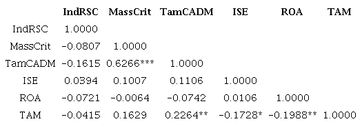 Observa-se que nenhuma das variáveis, independente e de controle, possuem correlações estatisticamente significativas com a variável dependente, ou seja, a formação de uma massa crítica de mulheres, assim como o tamanho do conselho ou mesmo o tamanho da empresa, participação no ISE e o retorno sobre o ativo não impactam no Índice de divulgação da Responsabilidade Social Corporativa.