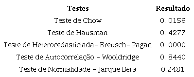 Na tabela 4, encontram-se os resultados dos testes de especificidades referentes a hipótese do estudo. Foram respectivamente os Teste de Chow, Teste de Hausman, Teste de Breusch-Pagan, Teste de Wooldrigde e Teste de Jarque Bera de normalidade.