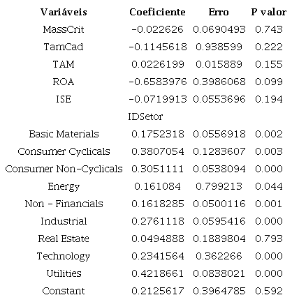 Os resultados sugerem que para influenciar o índice de RSC, somente o retorno sobre ativo e alguns setores de atuação foram significantes a 1% (Basic Materials, Consumer Cyclicals, Consumer Non-Cyclicals, Non- Financials, Industrials, Technology e Utilities).