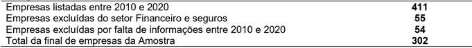 A amostra desta pesquisa compõe-se de todas as empresas brasileiras não financeiras listadas na B3 no período entre 2010 e 2020. Foram utilizadas informações trimestrais das empresas, dado que as crises possuem comportamentos distintos nos períodos do ano. A exclusão das empresas financeiras se deve ao fato destas empresas se submeterem a legislações específicas e o período da pesquisa se justifica pelo fato das empresas brasileiras terem aderido às International Financial Standards Reporting (IFRS) a partir do ano de 2010, bem como pelo fato dos formulários de referências estarem disponíveis também a partir deste ano. Os dados para pesquisa foram retirados da base de dados Economática © e dos formulários de referência das empresas disponíveis no site da Comissão de Valores Mobiliários (CVM) e foram tratados nos softwares Stata SE 17.0 © e no Microsoft Excel ©. Todas as informações referentes aos conselheiros de administração foram operacionalizadas utilizando-se o número dos cadastros de pessoa física (CPF), uma vez que erros ortográficos dos nomes poderiam causar erros nas variáveis. A tabela a seguir sintetiza a amostra da pesquisa: