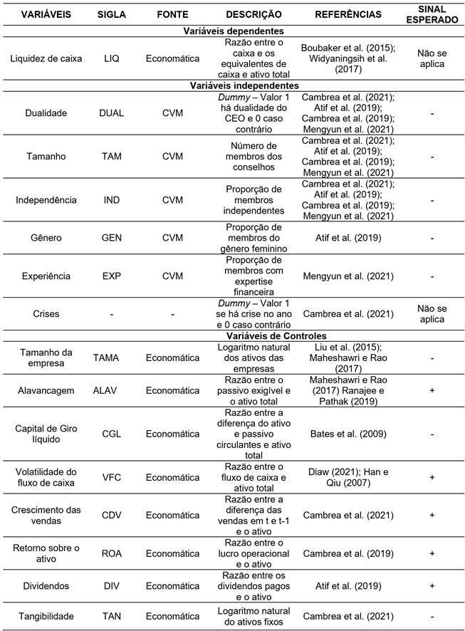 Quanto ao retorno sobre os ativos das empresas, espera-se que empresas mais lucrativas possuam mais caixa, uma vez que possuem menor dependência de recursos externos (Cambrea et al. 2019). Segundo Atif et al. (2019), o pagamento de dividendos é um dos fatores que podem explicar a liquidez de caixa, uma vez que empresas podem determinar a quantidade de caixa a reter para o pagamento de dividendos aos acionistas. Assim, espera-se uma relação positiva entre a liquidez de caixa e os dividendos. Por fim, controlamos a tangibilidade, mensurada com o logaritmo natural dos ativos fixos da empresa, e espera-se que haja uma relação negativa da tangibilidade com a liquidez de caixa (Cambrea et al. 2021). A tabelaa seguir sintetiza as variáveis da pesquisa.