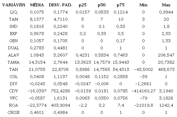 A estatística descritiva tem como objetivo demonstrar como as variáveis estão apresentadas quantitativamente, buscando a análise geral da amostra. Para isso, a tabelaabaixo apresenta a média, o desvio padrão, os percentis 25, 50 e 75, bem como os valores mínimos e máximos das variáveis.