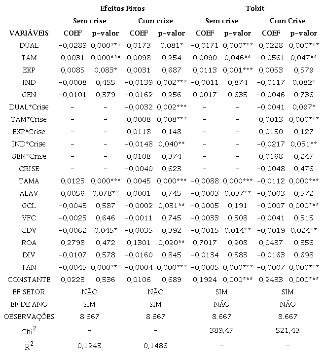As regressões abaixo são operacionalizadas levando-se em consideração os períodos de crises econômicas e os períodos sem crises econômicas. Os modelos foram estimados utilizando-se o modelo de Efeitos fixos, seguindo os valores do teste de Hausman não reportados, e o modelo Tobit, dado que a variável dependente da amostra possui uma grande quantidade de valores iguais a zero e assume apenas valores positivos, tornando a amostra censurada à esquerda. Segundo Gujarati e Porter (2010), a utilização do modelo Tobit é mais adequada que outros modelos, pois possibilita a geração de parâmetros mais consistentes quando as variáveis são limitadas ou somente positivas com uma quantidade significativa de valores iguais a zero. A tabela a seguir mostra os resultados das regressões.