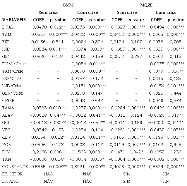 A fim de demonstrar a robustez dos resultados encontrados, regredimos o modelo empírico utilizando os estimadores Métodos dos momentos generalizados (GMM) e Mínimos quadrados em dois estágios (MQ2E), utilizando como variáveis instrumentais nos modelos a defasagem de um ano das variáveis explicativas. As variáveis que representam posições econômicas das empresas, como a liquidez de caixa, apresentam difícil controle de endogeneidade, principalmente por conta da causalidade reversa que possam conter. Neste caso, o método GMM torna-se adequado, pois por mais que exista endogeneidade no modelo, ele consegue estimar coeficientes robustos. Da mesma forma, segundo Carter, Simkins e Simpson (2003), variáveis que mensuram características de conselhos de administração podem também conter problemas de endogeneidade. Segundo Boubaker et al. (2015), modelos em dois estágios como o MQ2E são adequados para estimação de modelos que utilizem variáveis de conselhos de administração.