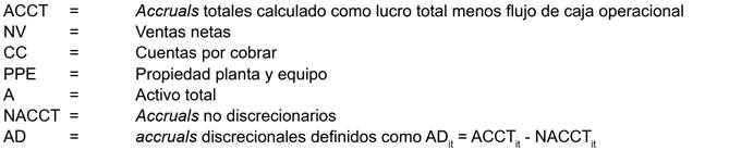 De este modelo, los accruals no discrecionales son definidos de la siguiente manera:
