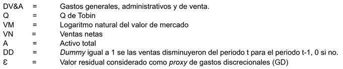 Siguiendo a Gunny (2010), los modelos (2) y (3) incluyen la variable Q de Tobin como proxy del beneficio marginal al costo marginal de instalar una unidad adicional de una nueva inversión. También el logaritmo natural del valor de mercado del capital social (VM) para controlar el tamaño. Por otro lado, la adicion de la variable DD en el modelo (2) pretende controlar los costos rígidos. Los costos son rígidos si la magnitud de un aumento de costos asociado con un aumento de las ventas es mayor que la magnitud de una disminución de los costos asociada con una disminución igual de las ventas. No incluir el elemento ∆VN*DD en dicho modelo, puede llevar a subestimar (sobrestimar) la respuesta de los gastos a los aumentos (disminuciones) en las ventas.