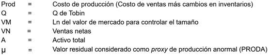La producción anormal implica aumentar las unidades fabricadas más allá del nivel necesario para cubrir las ventas para distribuir los costos fijos entre un volumen mayor de unidades, con el propósito de aumentar las ganancias en el corto plazo (Cohen & Zarowin, 2010). Para capturar los niveles de sobreproducción es utilizado el siguiente modelo siguiendo a Roychowdhury (2006) y Gunny (2010):