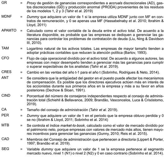 El articulo busco analizar la relación entre el uso de MDNF en los contratos de incentivos y la gestión de ganancias. Para capturar proxies de gestión fue utilizado el modelo de accruals de Dechow et al. (2012) así como los modelos de gastos discrecionales y producción anormal. La muestra fue conformada por 128 empresas no financieras de diferentes sectores, con datos organizados y explorados en panel desbalanceados a partir del año 2012 hasta 2019. Las regresiones fueron ejecutadas con mínimos cuadrados ordinarios clusterizados con errores estándar robustos, ante la existencia de heterocedasticidad y/o autocorrelación.