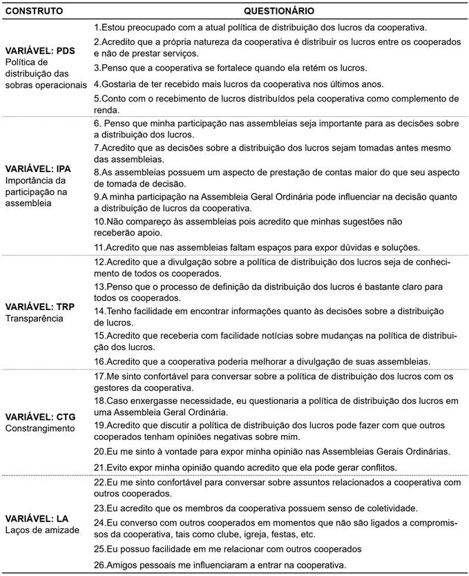 Para buscar entendimento sobre o efeito da Ignorância Pluralística no processo de distribuições das sobras operacionais foi elaborado um questionário com 47 questões assertivas sobre a política de distribuição das sobras (PDS), transparência (TRP), constrangimento (CTG) e laços de amizade (LA) (Apêndice A. Dado suplementar 1 - Questionário da pesquisa). Nas primeiras 26 questões o participante respondeu sobre suas opiniões e na sequência as questões eram semelhantes, porém foi questionado sobre o que ele acredita ser a opinião dos demais cooperados. Para todas as assertivas foram utilizadas escala Likert de 7 pontos, onde 1 significava discordar totalmente e 7 concordar totalmente. Também foram feitos questionamentos sociodemográficos como estado civil, idade, gênero, nível de escolaridade, tempo como cooperado e ramo da cooperativa.