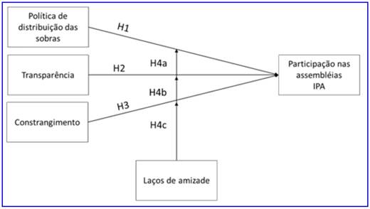 Desta forma, as hipóteses de pesquisa que têm como objetivo verificar a relação entre política de distribuição das sobras, transparência na divulgação das assembleias e constrangimento social e a percepção da importância de participação nas assembleias, podem ser representadas pelo modelo de pesquisa apresentado na Figura 1.