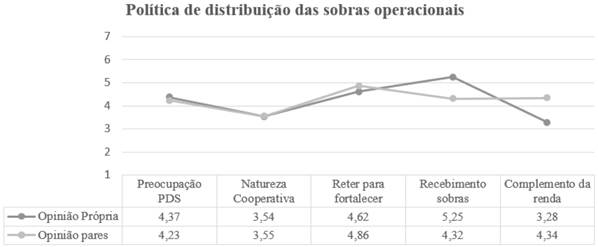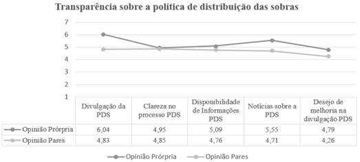 Como pode ser observado no Figura 3, as questões sobre transparência quanto a definição sobre a clareza no processo e disponibilidade das informações sobre a distribuição dos lucros (das sobras) não apresenta divergência entre a opinião pessoal e a opinião sobre o que os pares pensam. No entanto, observa-se um distanciamento na divulgação da PDS. Individualmente, os participantes acreditam que a política de divulgação é conhecida (Me=6,04), mas quando questionados se acreditam que os demais cooperados tinham esse conhecimento a média das respostas foram bem menores (Me=4,83).