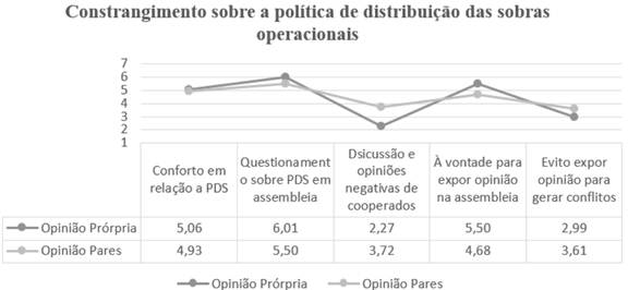 Em relação ao constrangimento sobre a política de distribuição das sobras operacionais, a hipótese inicial era que questões como sentimento de conforto em conversar sobre o tema e para se expressar nas assembleias, a possibilidade de questionar, o receio com a própria imagem e o medo de conflitos não apresentam diferenças entre a opinião individual e a percepção da opinião entre os pares.