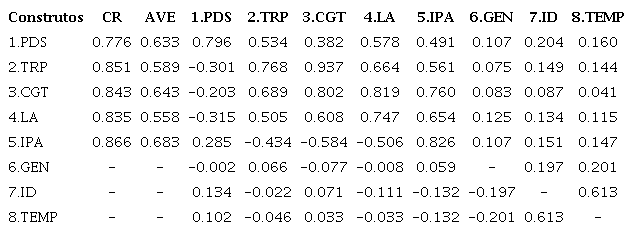 Para atender ao segundo objetivo deste estudo foi aplicada a modelagem de equações estruturais, baseada nos mínimos quadrados parciais. Para tanto, a primeira etapa desta análise consistiu na execução da técnica algoritmo PLS, que permitiu avaliar a validade e confiabilidade dos construtos. Apresenta-se na Tabela 5 o modelo de mensuração.