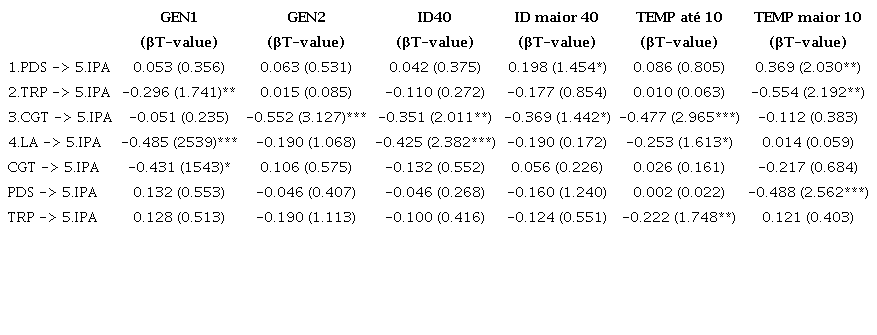 Adicionalmente, a análise de robustez foi efetuada para avaliar as diferenças das relações avaliadas no modelo principal, subdivididas pelas variáveis de controle (ver Tabela 7). Quando controlado pelo gênero, percebeu-se que: (i) a TRP afeta negativa e significativamente a importância percebida da participação das assembleias (GEN1); (ii) que a CGT influencia negativamente no IPA, e (iii) LA modera negativamente a relação entre CGT e a IPA.
