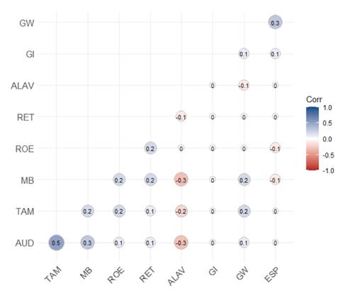 A Figura 1 apresenta as correlações entre as variáveis consideradas na regressão logística. A correlação foi medida pelo rho de Spearman. Pode-se observar, então, que existem várias variáveis correlacionadas, mas que a maioria delas não apresentaram altas associações, não levantando preocupações em relação à multicolinearidade. As maiores correlações foram entre as variáveis explicativas TAM e AUD com uma correlação de 50%, MB e AUD com uma correlação de 30% e ALAV e MB também com uma correlação de 30%.