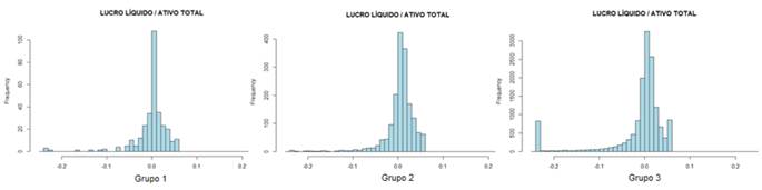A evidência de small loss avoidance pode ser visualizada através da inspeção de um histograma da variável Lucro Líquido escalonada pelo Ativo Total. A Figura 2 mostra o histograma desta variável para cada Grupo de estudo onde fica claro a ocorrência muito mais frequente de resultados imediatamente acima do zero do que imediatamente abaixo do zero para o Grupo 1. Segundo Burgstahler e Dichev (1997), seria esperado que a distribuição dos lucros fosse contínua ao redor do zero. Assim, a quebra de frequência entre os resultados logo abaixo de zero e logo acima de zero é vista como uma evidência da manipulação dos dados contábeis para se evitar a divulgação de prejuízos.