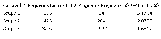 A terceira variável, GRC3 consiste em comparar o número de ocorrências de pequenos lucros com o número de ocorrências de pequenos prejuízos. Para ser classificado como um pequeno prejuízo, o valor reportado precisa estar na faixa de -0,01 a 0,00 em relação ponderado pelo Ativo Total e para ser classificado como um pequeno lucro o valor reportado precisa estar na faixa de 0,00 a 0,01 também ponderado pelo Ativo Total. Valores mais altos desta medida indicam que as empresas exercem discricionariedade contábil de modo a transformar um resultado contábil que seria um pequeno prejuízo em um pequeno lucro (Burgstahler & Dichev, 1997). Essa prática é conhecida na literatura como small loss avoidance. Assim, a medida GRC3 é calculada como mostrado na Equação (3):