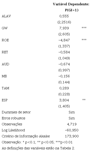 Nesse tópico, a análise segue com o intuito de identificar as características das empresas que estejam correlacionadas com a decisão de reconhecer perdas por impairment do goodwill, utilizando-se de um modelo logit, visto que a variável dependente (reconhecimento do GI) consiste em uma variável dummy. A Tabela 11 mostra os resultados da regressão logística e a Tabela 12 mostra os respectivos efeitos marginais. Os erros-padrão são robustos à heteroscedasticidade e o Variance Inflation Factor (VIF) não indica que há multicolinearidade prejudicial ao modelo (todas as variáveis têm VIF menor que cinco).