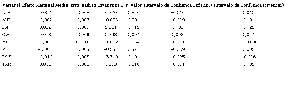 Conforme pode ser observado na Tabela 11, a variável GW tem um coeficiente positivo e significativo a 1%, indicando, conforme esperado, que empresas com valores mais elevados de goodwill em seu ativo têm uma probabilidade maior de registrar perdas por impairment (Giner & Pardo, 2015). Os efeitos marginais mostram que o aumento de uma unidade no goodwill escalonado pelo ativo total está relacionado ao aumento na probabilidade de reconhecer um impairment em 2,6 pontos percentuais. A variável ROE tem um coeficiente negativo e estatisticamente significativo a 1% indicando que empresas mais rentáveis são menos propensas a realizar impairment do goodwill, o que é condizente com os achados de AbuGhazaleh et al. (2011). Pelos efeitos marginais, o aumento de um ponto percentual no ROE está associado à redução de 1,6 p.p. na probabilidade de a empresa reconhecer um impairment do goodwill. Esse resultado é esperado já que goodwill que precisou ser reavaliado para baixo está provavelmente prejudicando a rentabilidade da empresa. Em complemento à análise na Seção 4.2, este resultado sugere que as empresas que têm maior rentabilidade não precisam gerenciar seus resultados através do small loss avoidance. Finalmente, a variável ESP demonstrou significância a 1% sugerindo que quando os resultados contábeis (lucro) são maiores que os efetivamente esperados, as empresas tendem a reconhecer mais perdas por GI, consistente com a pesquisa de McNichols e Wilson (1988), que evidenciaram que quando os lucros estão maiores ou menores que o esperado, a tendência é que se escolham accruals para fazerem a equalização dos resultados. Os efeitos marginais mostram que o aumento de uma unidade em ESP está relacionado ao aumento de 1,2 p.p. na probabilidade de a empresa reconhecer o impairment do goodwill.