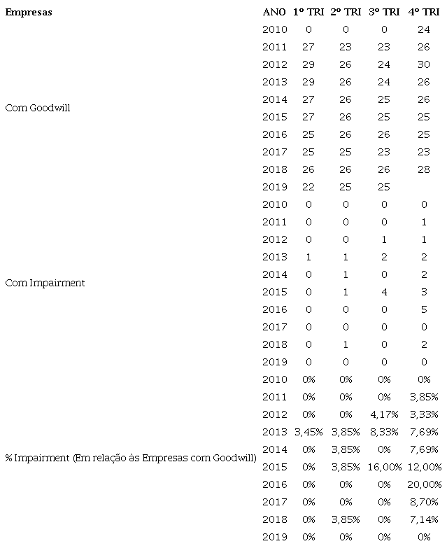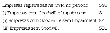 A Tabela 1 mostra a quantidade de empresas subdivididas entre aquelas que reportaram despesas com impairment do goodwill, as que tiveram goodwill no balanço, mas não registraram despesa de impairment e as que nem tinham goodwill no balanço. Como é possível ver na tabela, há uma grande variação entre a quantidade de empresas em cada grupo, o que pode limitar o alcance dos resultados.