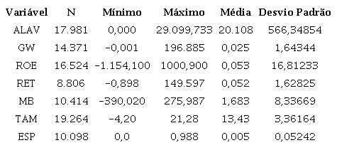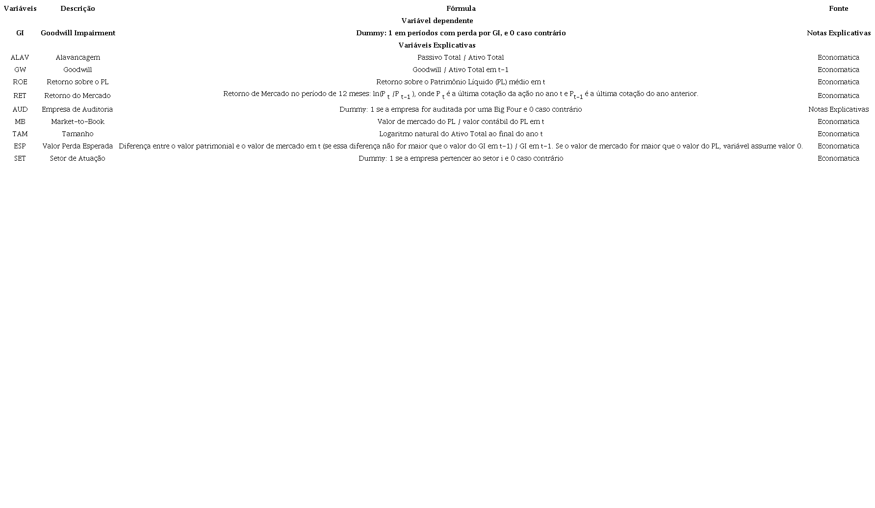 Em relação a variável ALAV, a presente pesquisa acompanha o modelo de Giner e Pardo (2015) diferindo de outros estudos nos quais apenas dívidas são incluídas no numerador, uma vez que as empresas dependem dos financiamentos a médio prazo e a inclusão desse financiamento fornece uma imagem mais clara desta variável. A variável GW em t-1 capta decisões atrasadas em relação ao impairment do goodwill (Li & Sloan, 2017). A rentabilidade do patrimônio líquido (ROE) controla pelo desempenho das empresas, uma vez que pesquisas anteriores mostram que o desempenho tem relação com o reconhecimento de GI (AbuGhazaleh et al., 2011). RET e MB levam em consideração as percepções dos investidores sobre a empresa (Bradbury, Godfrey, & Koh, 2003; Chalmers, Clinch, & Godfrey, 2008). Para controlar outros aspectos que podem influenciar a decisão, foi considerada também a variável tamanho (TAM) medida como o logaritmo natural do total de ativos, que também pode ser usado como proxy pela capacidade da empresa de seguir as disposições estabelecidas nas IFRS (Ramanna & Watts, 2012). A variável ESP (perdas esperadas), por sua vez, capta a tendência de que quando os resultados contábeis (lucro) são maiores que os efetivamente esperados, as empresas tendem a reconhecer mais perdas por GI (Cappellesso et al., 2017).