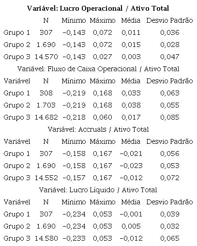 Por meio da Tabela 4 se observam os valores mínimos, máximos, médios e os desvios-padrão das variáveis Lucro Operacional, Fluxo de Caixa Operacional, Accruals e Lucro Líquido (todas as variáveis são escalonadas pelo Ativo Total). As estatísticas descritivas estão divididas por grupo. Conforme explicado na Seção 3, o Grupo 1 representa as empresas com goodwill e que divulgaram despesas de impairment. Essas empresas são minoria na amostra, somando apenas 307 observações referentes a oito empresas (Eternit, Gafisa, Gerdau, Gerdau Met, Minerva, Petrorio, Qualicorp e Tegma). O Grupo 2 é formado pelas empresas com goodwill mas que não divulgaram impairment, e somam 1.690 observações. Já o Grupo 3, formado pelas empresas sem goodwill, representa a grande maioria da amostra, com um total de 14.570 observações. Segundo a Tabela 4, as empresas do Grupo 3 apresentam prejuízos na média e valores de Lucro Operacional e de Fluxo de Caixa Operacional muito abaixo que as médias do Grupo 1 e do Grupo 2. As empresas de todos os grupos têm Accruals médios negativos, sendo que o Grupo 3 tem níveis mais baixos de Accruals. A quantidade de observações em cada grupo varia entre as variáveis porque uma mesma empresa pode ter um dado faltante para uma variável, mas não para outra.