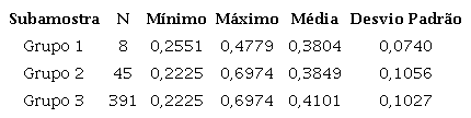 A Tabela 8 mostra estatísticas descritivas da variável GRC1 , que mede o income smoothing, para os três grupos de empresas. A variável GRC1 é calculada como a razão entre o desvio-padrão do Lucro Operacional e o desvio-padrão do Fluxo de Caixa Operacional. Quanto menor for o desvio-padrão do Lucro Operacional em comparação ao do Fluxo de Caixa, maior é a evidência de income smoothing. Assim, menores valores de GRC1 indicam maior gerenciamento de resultados.