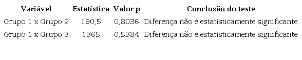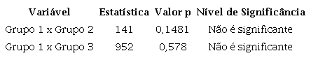 Na Tabela 6, as empresas do Grupo 1 apresentam valores menores na variável GRC1 que os demais grupos. Para testar a hipótese de que essas empresas suavizam mais resultados que as demais, foram feitos testes de Wilcoxon (teste não paramétrico escolhido devido ao tamanho da amostra) entre os valores médios de cada grupo, apresentados na Tabela 7. Os resultados na Tabela 7 mostram que, apesar da Tabela 6 sugerir que a média de GRC1 é menor para o Grupo 1, as diferenças de médias entre o Grupo 1 e o Grupo 2 e entre o Grupo 1 e o Grupo 3 não são estatisticamente significantes. Assim, a partir dos resultados da Tabela 7 não é possível afirmar que as empresas do Grupo 1 suavizam mais seus resultados que as demais.