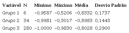 A Tabela 8 mostra a estatística descritiva da variável GRC2 , que também mede income smoothing, para os três grupos de empresas. A variável GRC2 é calculada como a correlação entre a variação dos Accruals (escalonados pelo Ativo Total) e a variação do Fluxo de Caixa Operacional (também escalonado pelo Ativo Total). Quanto mais negativa for a correlação entre Accruals e Fluxo de Caixa, maior é o descasamento entre as duas variáveis, indicando também uma evidência de income smoothing. Assim, valores mais negativos de GRC2 indicam maior gerenciamento de resultados.