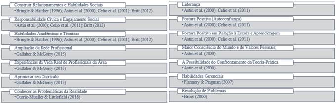 Ademais, há aspectos de vivência, na prática profissional, que podem ser explorados nas atividades de Service-Learning, que podem prover a ampliação da rede de contatos profissionais, experiências da vida real com profissionais da área de atuação e aprimoramento de seus currículos (Gallagher & Mcgorry, 2015). O desenvolvimento de habilidades gerenciais (Flannery & Pragman, 2008) e de resolução de problemas (Brown, 2000) são, da mesma forma, oportunidades de desenvolvimento pelo Service-Learning. A Figura 1 apresenta essa síntese.