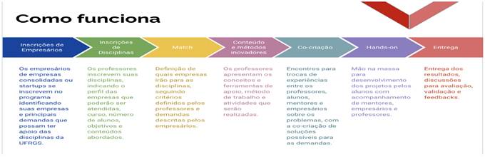 A experiência de Service-Learning foi realizada com o projeto de extensão SOS-PME. Brauner et al. (2020) destacam que este tem o intuito de ajudar as micro, pequenas e médias empresas (PMEs) que vêm sofrendo os efeitos da pandemia de Covid-19 e mostrar como uma universidade empreendedora pode ser ágil na resposta às necessidades emergentes da sociedade. Com um formulário online, os proprietários das empresas se inscrevem para serem atendidos por equipes voluntárias ou formadas a partir do Service-Learning, que funciona como exposto na Figura 2.