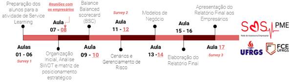 A disciplina acontecia em 18 semanas de aula, com seis semanas de conteúdo e de preparação para a execução da atividade de Service-Learning e 10 semanas de atendimentos. Estes ocorreram de forma remota, durante três semestres (2020-1, 2020-2 e 2021-1), e envolveram 188 estudantes e 67 empresas. As aulas foram compostas por apresentação de conteúdo para os alunos, organização das equipes e conversa com os empresários. Aqueles realizaram os encontros com estes em salas de comunicação virtual Elos (http://elos.vc) e mantiveram documentos compartilhados em nuvem (Drive, OneDrive), sendo que o WhatsApp foi a principal ferramenta de comunicação, todas essas representam a inovação tecnológica mencionada por Joshi e Chucg (2009). A disciplina tinha um monitor que acompanhava todas as atividades. A Figura 3 sintetiza as etapas da experiência de Service-Learning, destacando as atividades desenvolvidas durante as semanas dos atendimentos aos empresários.