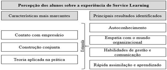 Results: : Show that students perceived the Service-Learning experience as intense, challenging and enriching. The main characteristics were: contact with the entrepreneur; joint construction; and theory applied in practice. The key findings, according to the students, are self-knowledge; empathy with the organizational world; management and communication skills; and fast assimilation and learning.