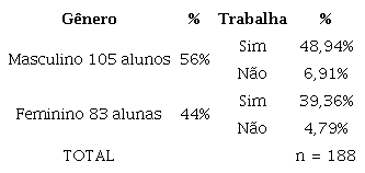 Nesta seção, apresenta-se o perfil dos 188 discentes que participaram da disciplina de Planejamento Contábil, nos três semestres, e suas percepções durante e no final da atividade de Service-Learning. A Tabela 1 apresenta os dados descritivos do perfil dos respondentes, evidenciando equilíbrio com relação ao gênero, leve predominância do sexo masculino (56%) e grande maioria no mercado de trabalho (90,9%).