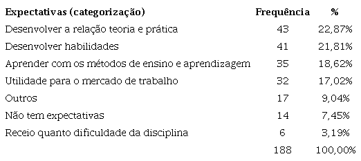 A maioria dos alunos apontou que a expectativa era de que a disciplina desenvolvesse a relação entre a teoria e a prática, possibilitando seu confrontamento, conforme sugerem Astin et al. (2000). Nesse sentido, destaca-se trechos que ilustram essa expectativa: “Espero sair um pouco do campo das ideias e colocar a mão na massa” (Aluno 21); “Eu espero que tenha bastante atividades práticas, pois as outras disciplinas realizadas anteriormente considerei muito teóricas. Isso será muito importante para eu saber mais sobre como executar a minha profissão” (Aluno 33); “Pretendo estar preparada para auxiliar meus amigos empreendedores antes da graduação, e ter a possibilidade de colocar tais conhecimentos em prática na minha vida profissional.” (Aluno 168). Evidencia-se a expectativa dos alunos em compreender como os conteúdos trabalhados na universidade serão úteis no mercado profissional, sendo clara a percepção dos discentes quanto ao ensino descontextualizado com suas vivências e dia a dia.