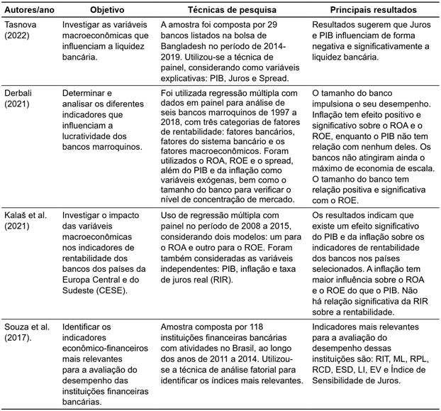 Estudos internacionais investigaram a relação entre indicadores contábeis de desempenho bancário e indicadores socioeconômicos. Derbali (2021) relacionou indicadores endógenos (Retorno sobre o Ativo [ROA], Retorno sobre o Patrimônio Líquido [ROE], tamanho do banco e spread com os exógenos (inflação e PIB) no segmento bancário marroquino. Kalaš, Mirović, Milenković e Andrašić (2021), por sua vez, investigaram os impactos das variáveis macroeconômicas (PIB, inflação e taxa de juros real [RIR]) na rentabilidade dos bancos de países europeus. Tasnova (2022) analisou a influência das variáveis macroeconômicas (PIB, Juros e Spread) na liquidez dos bancos de Bangladesh. No Brasil, Souza, Mendonça, Benedicto e Carvalho (2017) identificaram os indicadores contábeis mais relevantes para análise do desempenho econômico-financeiro e operacional para o setor bancário.