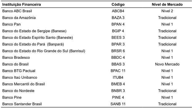 Assim, o depósito à vista foi obtido direto dos sites das instituições que divulgado por meio de outros tipos de relatório. Entretanto, um desses bancos foi excluído da amostra, pois, embora com dados disponibilizados pela Economática®, não foi localizado o depósito à vista trimestral no período de 2020 a 2021, restando, portanto, uma amostra de 390 observações. Na Tabela 2, é apresentada a relação das quinze instituições financeiras do segmento bancário listadas na B3 com dados disponibilizados pela Economática e com depósitos à vista constantes em seus respectivos sites.