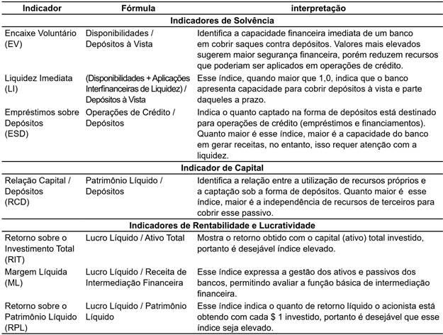 Os índices de desempenho econômico-financeiro e operacional foram escolhidos, considerando a pesquisa de Souza et al. (2017), que os identificaram como os mais relevantes para analisar o desempenho dos bancos, conforme Tabela 3.