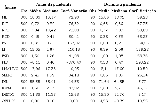 Os indicadores socioeconômicos utilizados foram: proporção da Dívida Interna Líquida (DIL) com série histórica disponibilizada pelo Bacen; inflação medida pelo Índice Geral de Preço - Mercado (IGP-M), disponibilizada pela Fundação Getúlio Vargas; taxa de desocupação (Desoc) e PIB oriundos do IBGE; número de óbitos decorrente da Covid-19 apontado pelo CONASS e ativo total conforme a Economática®.