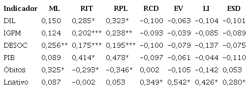 A Tabela 5 evidencia a associação entre os indicadores econômico-financeiros e as variáveis socioeconômicas. Os indicadores de retornos (RIT e RPL) apresentaram maior quantidade de associações significativas com as variáveis socioeconômicas, sendo todas elas positivas, exceto quanto ao número de óbitos por Covid-19.